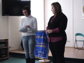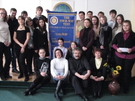 The Banner for the Interact Club in Sch. 155 was presented today to the Club by Lena Chaschina and Myron Spolsky, Kyiv Rotary Multinational. The banner was ordered from US, sent to Vankouver, B.C. to Dave White's sister, given to Dave White's son who brought it to Bangkok, Thailand, went into storage at the airport, picked-up and flown to Kyiv. The historical event symbolises joining the Sch. 155 Interact Club to the Rotarian community. |